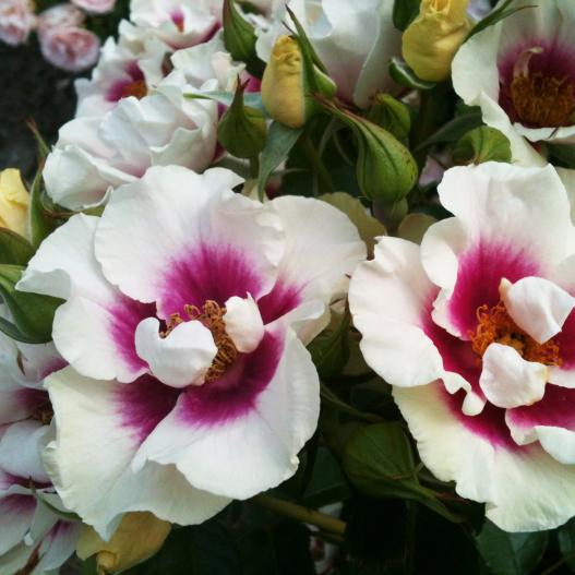 Des fleurs à foison sur ce rosier solide et facile. Avec ses fleurs blanches au cœur violet, il attire les abeilles et le regard. Il se plaît en massif au milieu des plantes vivaces comme sur la terrasse dans un joli pot.