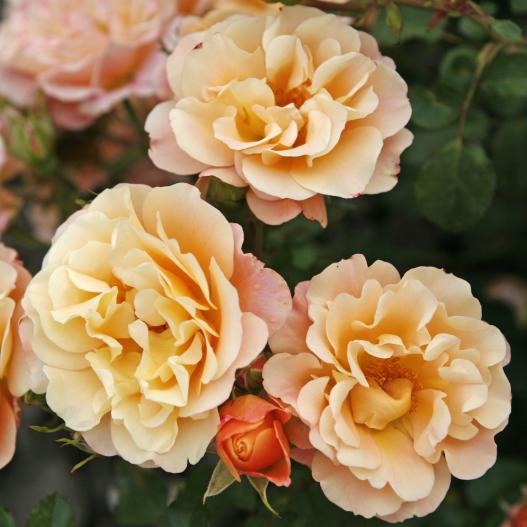 Étonnant rosier aux couleurs abricot et pêche ! Un cocktail qui fleurit tout l'été et qui n'est pas sensible aux maladies. Le port est buissonnant compact ce qui offre la possibilité de réaliser des massifs homogènes ressemblant à un tapis orangé !