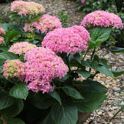 Beaucoup de fleurons composent les belles grandes têtes de cet hortensia qui refleurit sans cesse de mai à septembre ! Une solide charpente pour porter les grosses fleurs et un port ramassé. Peut bleuir.