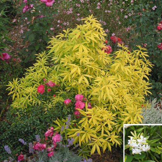 Un arbuste persistant élégant dont les fleurs blanches embaument. Très résistant au soleil. Sa belle teinte jaune d'or ne craint pas le soleil. Placez plusieurs Choisya Goldfingers au milieu de rosiers pour faire ressortir leur couleur.