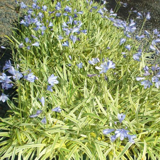 Golden Drop est une agapanthe au feuillage panaché vert et jaune qui agrémente les décors en dehors de la floraison. Les fleurs sont bleu lavande au dessus du feuillage lumineux en début d'été. Idéale en massif ou en pot.