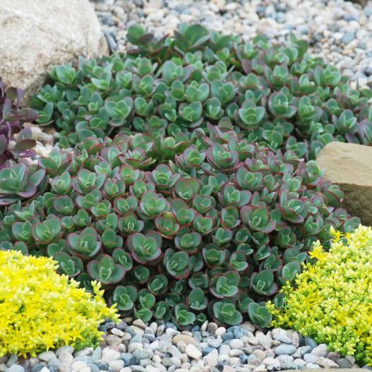 Le feuillage vert tendre bordé d'un liseré rouge est unique et lumineux. Ce n'est pas la simple originalité de cette plante car elle est en plus très résistante au froid et au sec et ne présente pas de problème face aux maladies. Lime Zinger est rampant et ne se dégarnit pas du cœur. Sa floraison est rose en fin d'été.