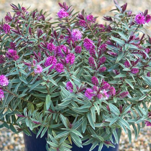 Cette véronique arbustive est originale par son feuillage panaché de blanc gris et de prune. Ses feuilles persistantes sont fines et longues. Elles composent un feuillage dense disposé sur des branches légèrement arquées formant un coussin natutellement rond. Pour garder sa forme, la plante n'a pas besoin d'être taillée. Le feuillage s'éclaircit avec les chaleurs de l'été et se fonce pour mieux marquer les nervures à l'automne et en hiver.