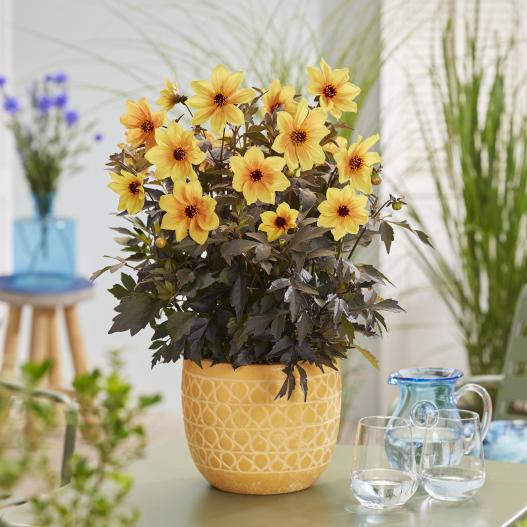 Cette fleur simple jaune-orangé se met parfaitement en valeur sur le fond noir du feuillage. La floraison est abondante tout l'été jusqu'à l'automne. Ces dahlias peuvent être mélangés aux massifs de vivaces et d'arbustes. Très belle mise en valeur dans les bacs et les pots.