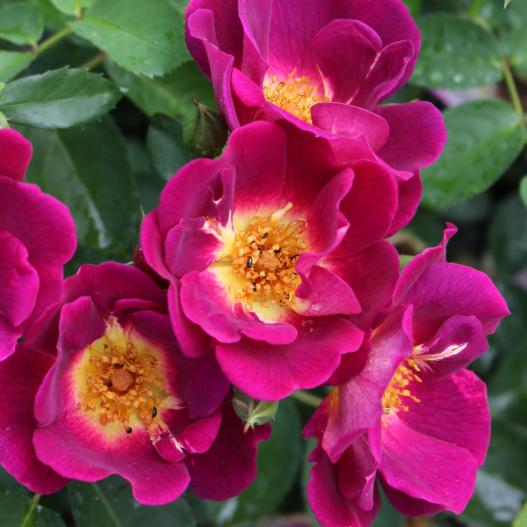 Naturellement résistant aux maladies, abondant d'une floraison continue du printemps à l'automne, ce rosiers possède toutes les qualités pour devenir un incontournable des jardins publics ou privés. Ses fleurs simples changent de couleurs en passant du violine au rose vif avec un cœur jaune. Les dernières fleurs de la saison ferront place à de gros fruits orangés décoratifs et comestibles qui resteront une partie de l'hiver. La végétation est dense et groupée ce qui en fait un remarquable rosier paysager ne laissant pas passer les mauvaises herbes.