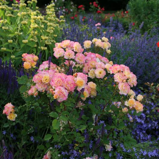 Ce rosier très vigoureux présente une grande densité de floraison, un feuillage dense et brillant. Ses fleurs très colorées, du jaune au rose soutenu, ont beaucoup de charme. Il est très résistant aux maladies.