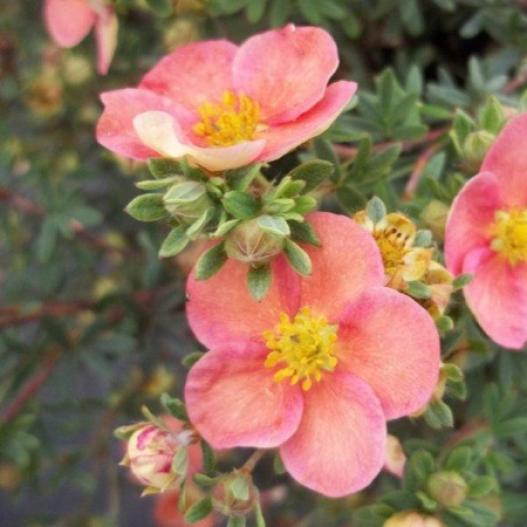 La floraison de cette potentille a la particularité d'être bicolore : le centre du pétale est orangé tandis que les bords sont roses. Cette floraison dure tout l'été et la défloraison est discrète, ce qui donne une allure élégante à la plante sans nécessité d'intervention. La plante possède un port compact et buissonnant, la rendant idéale pour une utilisation en bordure ou au premier plan d'un massif.