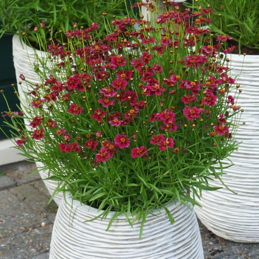 Cette série de coreopsis aux fleurs miniatures fleurie de mai à novembre sans interruption. Les fleurs fanées ne se voient pas parmi l'abondance de la floraison continue. Trois couleurs composent cette série, rose, pourpre et rouge. Les plantes sont compactes et se plaisent dans les massifs en premier plan ou en pot seules ou en mélange.