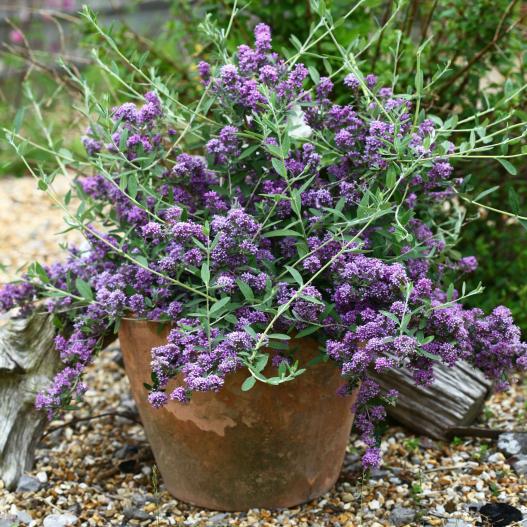 Le buddleja ‘Unique’ est très compact et buissonnant, il conviendra parfaitement pour agrémenter une terrasse ensoleillée, ou pour une utilisation en massifs. Sa floraison abondante en été se compose de panicules bleus/violets, et tranche élégamment avec son feuillage vert/gris.