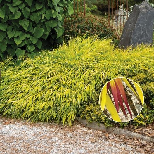 Graminée vivace et caduque idéale pour éclairer un sous-bois à la façon couvre-sol. Feuillage très souple couleur jaune-vert avec le bout des feuilles pourpre selon l'exposition. À l'automne, le feuillage passera de l'or à l'orange puis au pourpre. Peut également convenir dans une potée afin de la rendre plus souple.