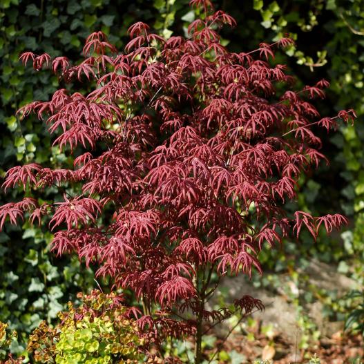 Son feuillage fin, très découpé est rouge foncé en été et devient rouge vif à l'automne. Son port est serré et étalé et sa végétation moyenne ce qui lui donne une dimension modeste recherchée pour les petits espaces. Il se plaît au jardin comme en pot à condition d'être dans un sol drainant et protégé des courants d'air froid.