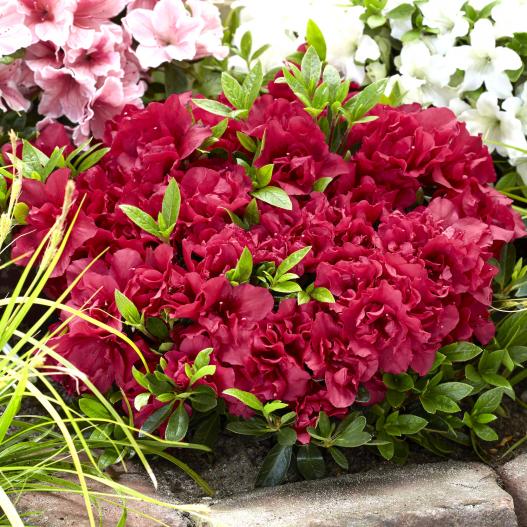 Avec deux floraisons par an au printemps et à l'automne, cette azalée prolonge l'éphémère des variétés classiques en arborant des fleurs d'un rouge flamboyant.