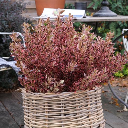 Tout en nuances ! Le feuillage est bordé de rouge alors que le centre est chocolat, presque noir en hiver et chocolat au lait avec la chaleur de l'été. Les changements de couleur de ce beau feuillage luisant font de cette plante une incontournable pour vos balcons et terrasses.