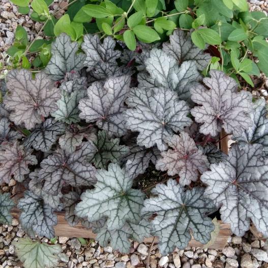 Variété aux feuilles gris métallique nuancé de vert et de pourpre, l'Heuchera WORLD CAFFÉ Corretto offre un beau feuillage découpé et marqué.