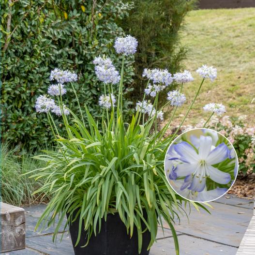 Cette variété au coloris unique qui mélange le blanc et le bleu ciel sur des grandes fleurs est abondante en floraison d'été. Les plantes sont résisantes au froid et elles fleurissent longtemps en pot comme en bac. À marier avec des graminées de faible dimension pour apporter la légèreté et mettre en évidence les grandes fleurs.