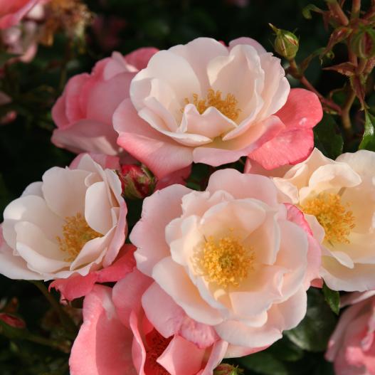 Très élégantes, les petites roses crème et rose saumon au bouquet d'étamines jaune d'or s'illuminent sur un feuillage vert vernissé et très sain. Son port évasé le rend idéal pour une utilisation sur le devant d'un massif, en bordure ou en pot, en compagnie d'une lavande 'Blue My Mind' et d'une armoise 'Powis Castle'.