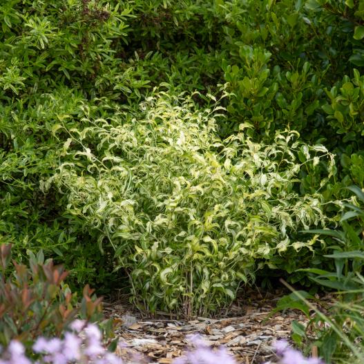 Cette plante originale se caractérise par une architecture de branches souples ornées de feuilles lumineuses bicolores vert et crème. Avec les premiers froids, les panachures crème se parent de rose. L'apparition des nouvelles pousses de printemps est du plus bel effet.