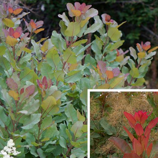 Les jeunes pousses sont rouges, puis elles laissent place à un feuillage vert turquoise, et à l'automne l'ensemble prend une couleur rouge feu. La végétation est moyenne à forte et les fleurs en perrruques illuminent la plante en fin de printemps.