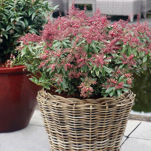 Le feuillage panaché de blanc donne une note suplémentaire à cet arbuste très florifère. Sa floraison rouge aux nombreuses grappes de fleurs lui donne un aspect de bouquet tant elle est dense. Polar Passion préfère les sols acides et le frais. Une exposition à mi-ombre est recommandée.