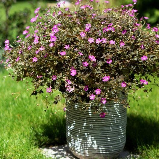Toujours en fleurs ce géranium vivace aux feuilles pourpres ! Il est rampant lorsqu'on le plante en massif, mais il est retombant si on le plante en pot ou en bac. Pour l'entretien, le mieux est de nettoyer la plante en hiver (novembre) et de tailler court au printemps.