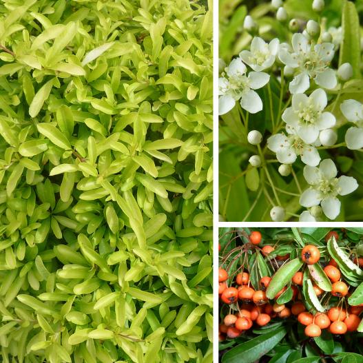 Golden Paradise produit des jeunes pousses jaune-orangé au printemps qui deviennent jaune d'or en été pour se transformer à nouveau en orange à l'arrivée de l'automne. Ces changements sont agrémentés de fleurs blanches en début d'été puis de fruits orangés à l'automne. Cette plante de moyenne végétation préfère les situations légérement ombragées pour garder son éclat. Elle n'est pas difficile au regard du sol et pousse également très bien en pot.