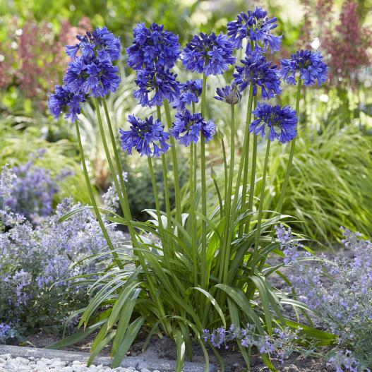 Le bleu intense presque nuit de cette agapanthe est unique. Courte et solide, elle se plaît dans les espaces de plein soleil, en pleine terre comme en pot.