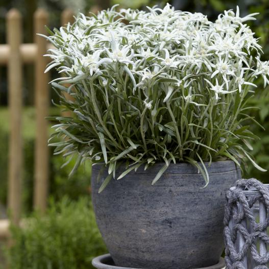 Enfin un edelweiss qui fleurit abondemment et deux fois par an, en fin de printemps et à l'automne. La plante peut se cultiver partout avec un sol drainant et en maintenant un niveau de fraicheur en été, comme à la montagne. Les fleurs peuvent se mettre en vase et la plante peut se cultiver en pot.