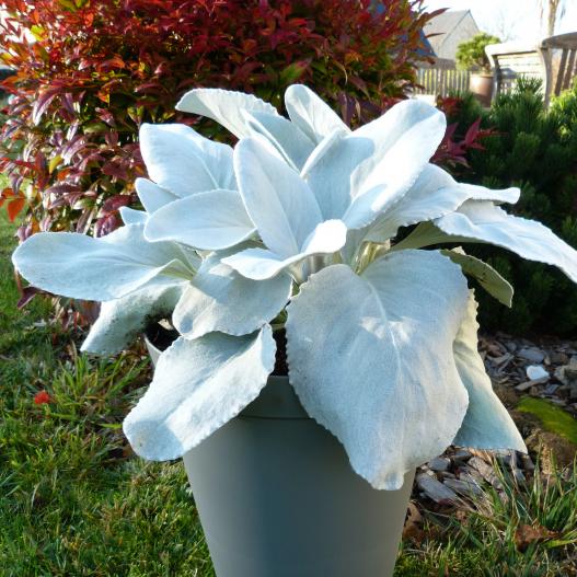Ce cinéraire maritime est original par ses grandes feuilles blanches légérement duveuteuses. La plante se plaît à l'ombre comme au soleil mais préfère les milieux aérés et non confinés. Elle peut se placer à la belle saison sur la terrasse et l'hiver dans la maison. Elle ne demande pas de soins particuliers puisqu'elle n'est pas exigeante en eau. Elle peut servir à mettre en valeur des plantes fleuries dans vos compositions.