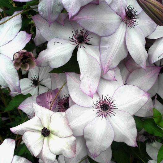 Clématites Collection® "Généreuses et faciles" : Une sélection de Clématites qui peuvent se faufiler partout : dans vos arbustes, dans vos plantes grimpantes établies ou bien seules sur un support. Pas d'entretien particulier, juste une taille de nettoyage au printemps et ensuite, des fleurs à profusion.