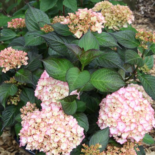 Très belles fleurs blanc-rosé bordées de rose foncé. Les inflorescences sont larges et forment des grosses boules aux reflets roses. Le feuillage est pourpre au printemps et à l'automne.