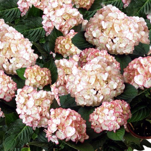 Les fleurs blanc crème sont délicatement bordées de rose vif. Elles forment des énormes boules. Pendant le printemps et l'automne, le feuillage pourpré accentue l'effet décoratif de cette variété.