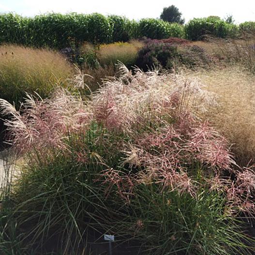 Avec son mètre de haut maxi, ce miscanthus aux grands épis roses agrémente les massifs et les bacs en fin d'été. C'est une plante facile qui ne demande pas d'entretien particulier.