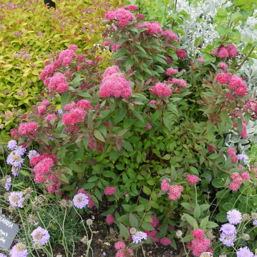 Il n'y a pas que les jeunes pousses qui sont rouges, mais également les boutons floraux qui apparaissent rouge foncé puis s'épanouissent vers un rose framboise. Cette petite spirée est compacte, facile à fleurir et toujours en beauté du printemps aux gelées. Elle se plaît dans tous types de terrains et d'expositions, en massif comme en pot.