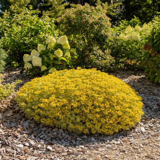 Sa panachure est présente toute l'année. Il n'est pas gourmand en eau. Il couvre le sol et étouffe les mauvaises herbes. Sa floraison commence avec des boutons floraux rosés suivie d'une ombelle de fleurs jaunes qui se marie très bien avec le feuillage et donne du relief à la plante. Cette plante est parfaite pour orner les pieds des arbres, les bords des potées, les toitures végétales, et les rocailles.