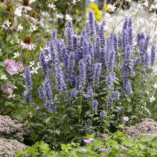 Il y a d'abord son feuillage panaché de crème qui se présente à vous dès le printemps, puis viennent les fleurs violines en été et jusqu'aux gelées. Vous pouvez même la couper en plein été, elle repoussera et refleurira immédiatement. Elle aime la chaleur, les sols secs. Elle se plaît en bac comme en pleine terre, seule ou accompagnée de vivaces persistantes.
