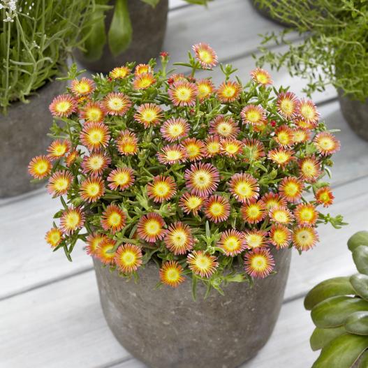 Cette nouvelle variété de Delosperma forme un tapis dense parsemé de pâquerettes bicolores jaune et rose saumon. Comme tous les Delosperma WHEELS OF WONDER, le Delosperma WoW Salmony Pink résiste à la sécheresse et au gel. Il se plaira en pot aussi bien qu'en massif.