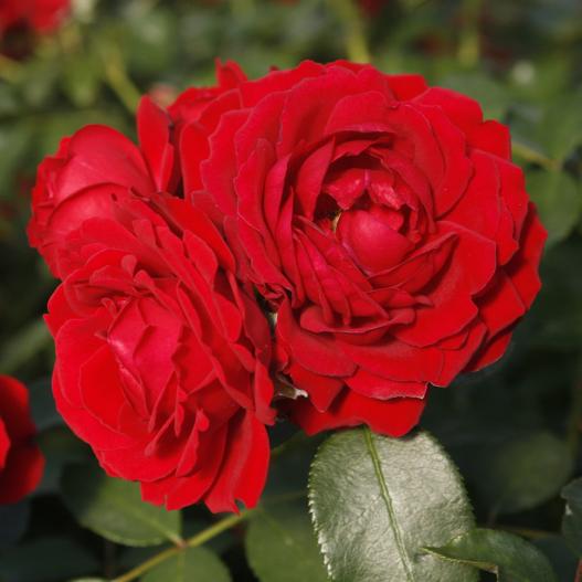 La fleur au coloris rouge profond est remplie de pétales qui lui donnent l'allure des roses d'antan. Elles sont composées en bouquets qui se renouvellent tout l'été sur un rosier compact et très résistant aux maladies.