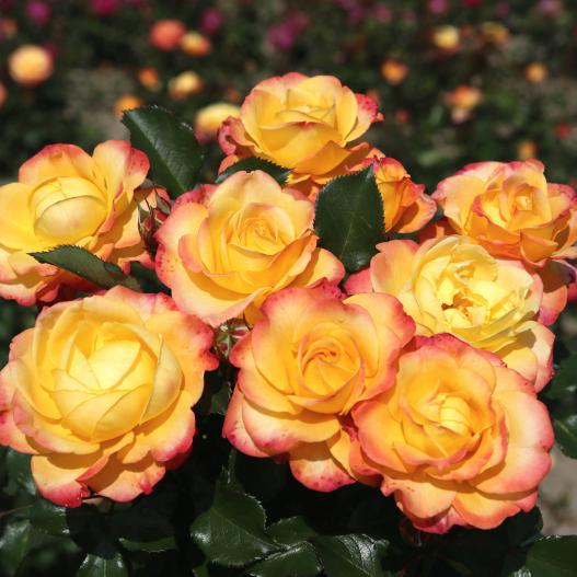 Ce rosier séduit par son coloris inédit bien marqué de rouge sur le pourtour des fleurs et du jaune d'or au cœur. Les boutons sont déjà bicolors et lorsque la fleur s'ouvre c'est un enchantement. Rosier puissant et résistant aux maladies.