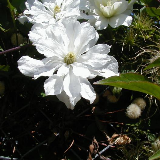 Très belle clématite de printemps aux nombreuses fleurs doubles, blanches. Cette variété très vigoureuse peut coloniser des murs, grillages ou pergolas. Associez-la aux rosiers pour un mariage de toute beauté.
