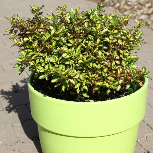 Cet arbuste persistant possède sur son feuillage un superbe panachage de verts nuancés et vivifiés par des touches de jaune, d'orange et de rouge, variant selon les saisons. Il est indispensable pour les potées !