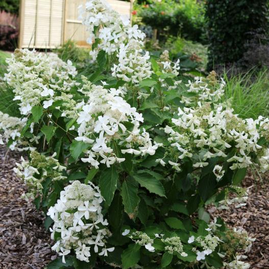 Cet hortensia paniculata possède une forte végétation érigée. Les grandes feuilles vertes soulignent la floraison généreuse. Les très grandes panicules peuvent mesurer jusqu'à 50 centimètres et rester droites dans toutes les conditions grâce à des tiges fortes.