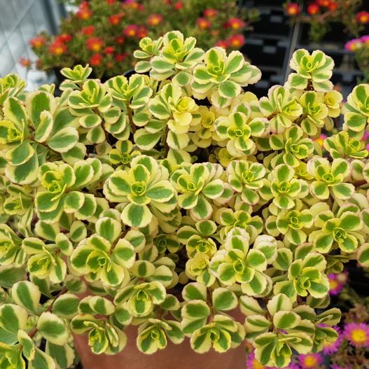 Ce petit sedum est séduisant par son petit feuillage panaché brillant et régulier tout au long de l'année. Les fleurs roses apparaissent en été et disparraissent à l'entrée de l'hiver comme par enchantement.