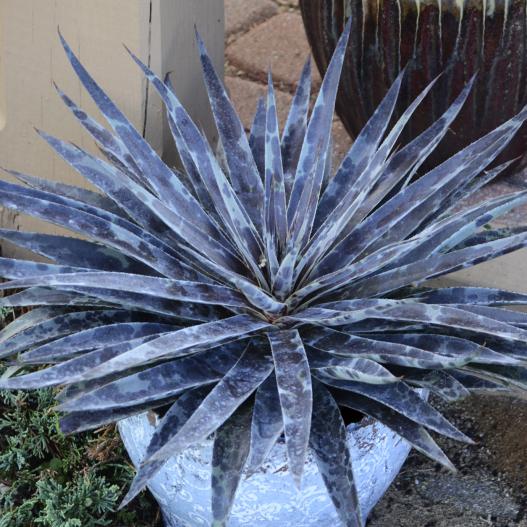 Les feuilles bleu-vert argentées dans presque un aspect brillant avec d’énormes taches violet-pourpre contrastantes par leur obscurité. La lumière directe du soleil intensifie les taches. Les feuilles plates sont maintenues rigidement à la base, formant un port bas, large et pointu mais relativement doux au toucher.