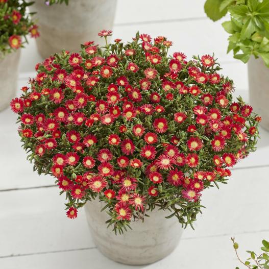 Cette nouvelle variété de Delosperma forme un tapis dense parsemé de fleurs d'un rouge chaud. Comme tous les Delosperma WHEELS OF WONDER, le Delosperma WoW Hot Red résiste à la sécheresse et au gel. Il se plaira en pot aussi bien qu'en massif.