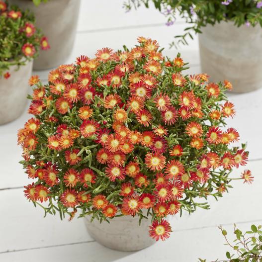Cette nouvelle variété de Delosperma forme un tapis dense parsemé de pâquerettes d'un orange chaud. Comme tous les Delosperma WHEELS OF WONDER, le Delosperma WoW Hot Orange résiste à la sécheresse et au gel. Il se plaira en pot aussi bien qu'en massif.