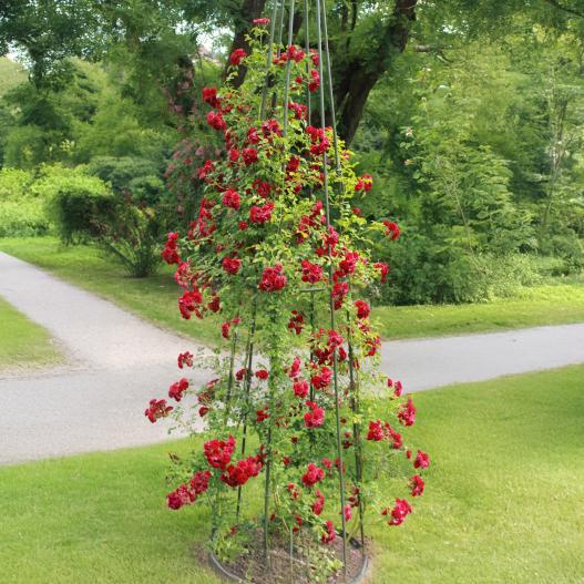 Crimson est un rosier grimpant de taille modeste portant des grappes très fleuries de petites roses rouge carmin. Variété idéale même pour les petits jardins.