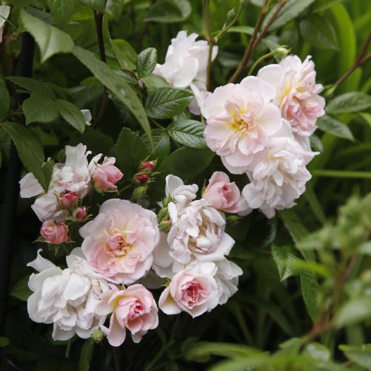 Rosier grimpant de taille modeste, Sweet porte de nombreux bouquets de roses blanc-rosé, remontant tout au long de l'été. Il est idéal pour les petits jardins et se comporte également très bien en pot.