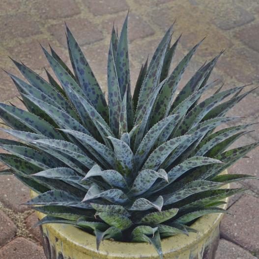 Un port raffiné et épineux rappelant le sommet d'un ananas. Les feuilles vert foncé, de 3 cm de large, sont longues et minces avec des taches bordeaux prononcées, mises en valeur par la lumière du soleil. Une couche cireuse donne aux feuilles une finition vert menthe.