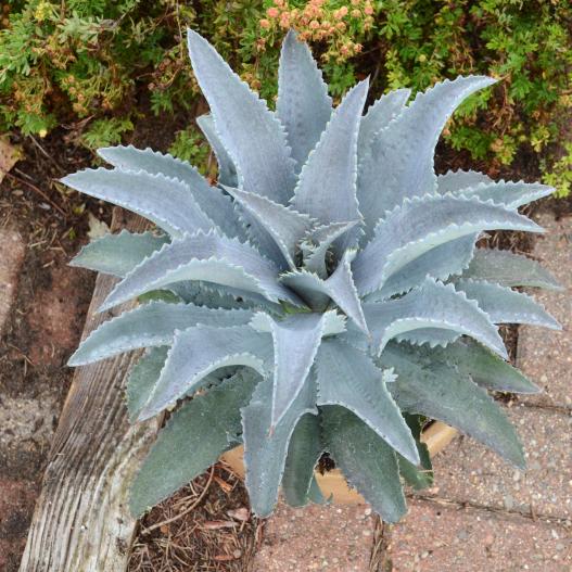 Les feuilles vert clair sont recouvertes d’un épais revêtement cireux, lui donnant l’apparence d’un blanc rougeoyant. Des taches bleu-violet clair sont visibles sous le revêtement. Un magnifique port, de feuilles épaisses et arquées et de dents marginales définies.