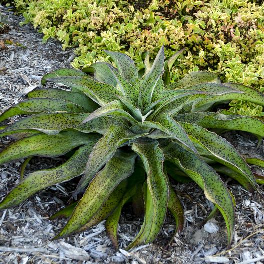 Les feuilles vert moyen sont couvertes de petites taches pourpre-bordeaux foncé, se repliant sur les marges pour afficher des dents marginales orange de sienne et de longues épines terminales. Les feuilles légèrement ondulées se chevauchent complètement, laissant peu ou pas d’espace entre elles.
